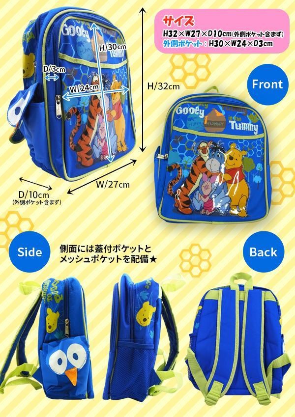 | プーさんと仲間達のデザインが目を引く、お子様向けのリュックです。両サイドにもポケットが付いており、ちょっとしたものを入れるのに便利。国内ライセンス商品は落ち着いた柄・色合いが多いのですが、派手でかわいいデザインは海外輸入ならでは♪ |