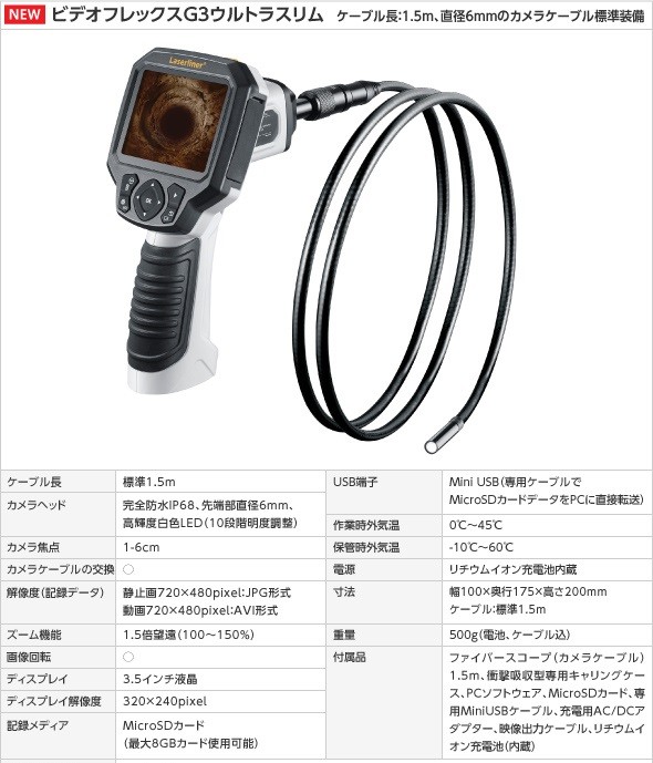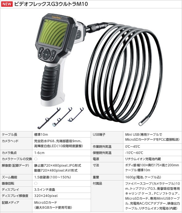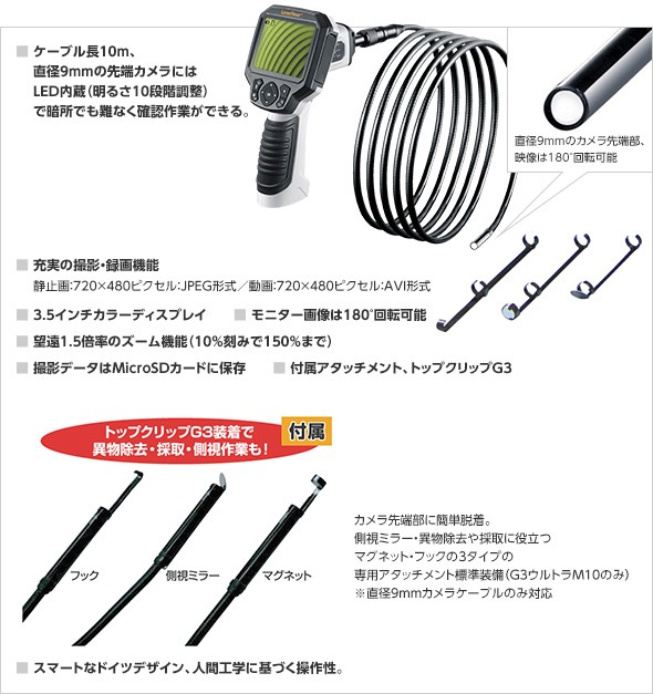 ●付属品:ファイバースコープ(カメラケーブル)10m、トップクリップG3、衝撃吸収型専用キャリングケース、PCソフトウェア、MicroSDカード、専用MiniUSBケーブル、充電用AC/DCアダプター、映像出力ケーブル、リチウムイオン充電池(内蔵)、取扱説明書、保証書、純正品検査証、コンタクトカード