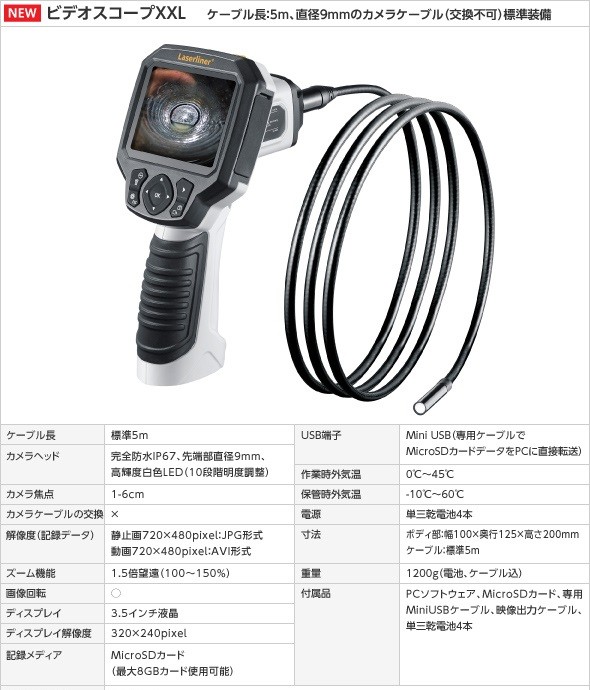 ●カメラヘッド:完全防水IP68、先端部直径9mm、高輝度白色LED(10段階明度調整)