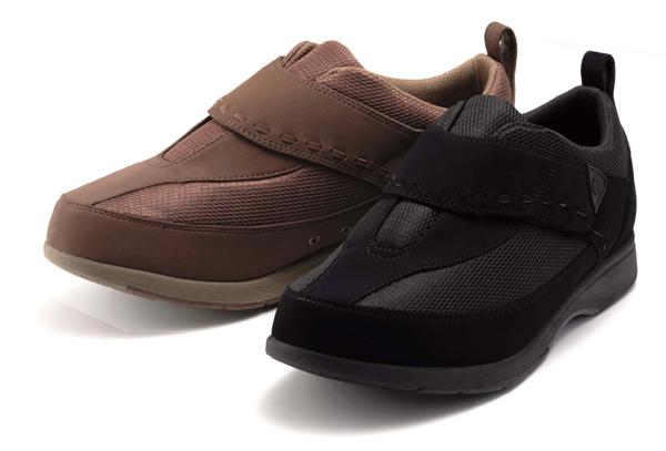 | 着脱が楽でしっかりフィットの1本ベルト。かかと部には、夜道も安心して歩ける反射材付き。つま先の反り返りでつまずきを防止! |
