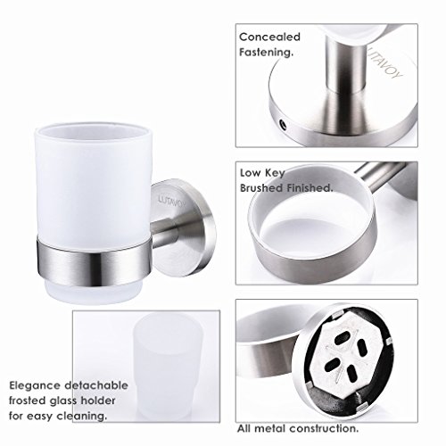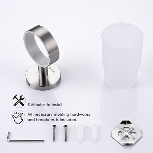 Sleek and Sturdy—The holder is carefully constructed from solid 304 stainless steel,which is highly durable,rustproof, resilient, hygienic, timeless and easy to maintain. Frosted glass tumbler cup is perfect to hold toothbrush and toothpaste