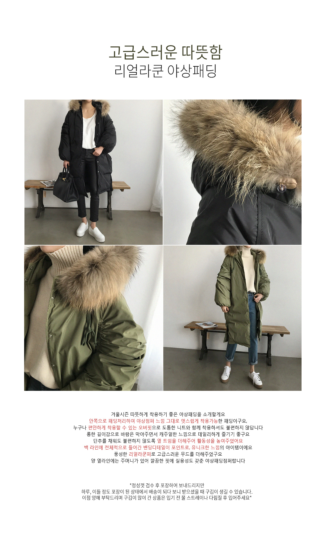 겉감폴리(polyester/)100%충전재(Filler/)웰론(wellon/)100%모자털(hoodfur)리얼라쿤(realraccoon)