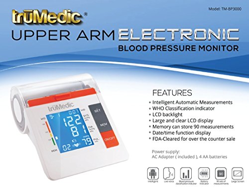 -. Binding : Health and Beauty -. Brand : truMedic -. EAN : 0754207800139 -. Feature : Storage capacity of up to 90 measurements, so you can measure changes over time. / World health organization (who) blood pressure classification levels to help you identify risk factors and dangerous levels. / Simple button controls and an automated power-saving feature that will trigger a shut-off one minute after use. -. IsAdultProduct : 0 -. Label : truMedic -. Manufacturer : truMedic -. Model : TM-BP3000 -. MPN : TM-BP3000 -. NumberOfItems : 1 -. PackageQuantity : 1 -. PartNumber : TM-BP3000 -. ProductGroup : Health and Beauty -. ProductTypeName : HEALTH_PERSONAL_CARE -. PublicationDate : 2016-06-06 -. Publisher : truMedic -. ReleaseDate : 2016-06-03 -. Studio : truMedic -. Title : truMedic TM-BP3000 Upper Arm Electronic Blood Pressure Monitor -. UPC : 754207800139
