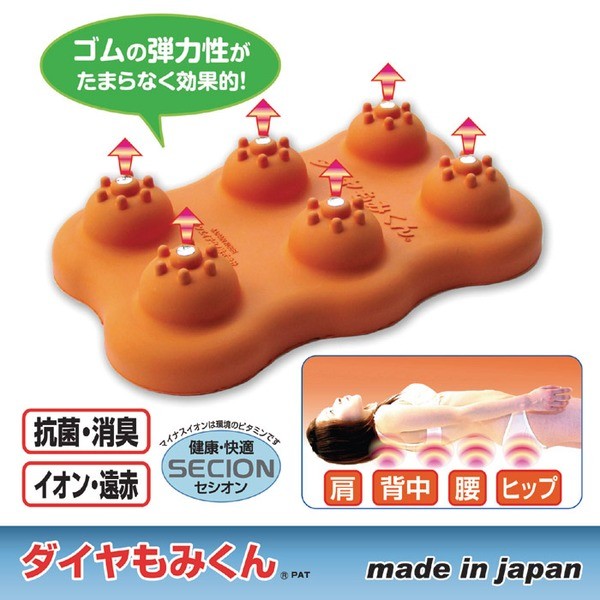 【商品名】 ツボ押し器具/ダイヤもみくん 大小48個突起付き (抗菌/防臭/イオン/遠赤) 【ジャンル・特徴】 ゴムの特性を活かした刺激的リラックス方法!マッサージ器具 ゴム製品の産地として有名な神戸から発信された本製品は、疲れきった現代人の身体に独自の発想と技術でアプローチするものです。寝転んだ状態で肩からお尻部分までをお好みでご使用ください。ゴムの特性を活かし、突起部分の弾力性が他の素材では出せない独自の感覚が特徴。天然ゴムに特殊素材「セシオン」を配合することで、マイナスイオンと遠赤外線も発生させます。■商品スペック【商品名】ダイヤもみくん 【販売元】シンエイテクノ 【生産国】日本 【セット内容】 【カラー】 【素材】天然ゴム、合成ゴム、セシオン、ゲルマニウム 【使用方法】 【サイズ】約幅15×奥行23×高さ5cm 【重量】約440g 【特記事項】 【注意事項】