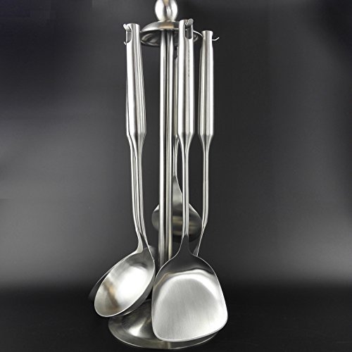 • High quality kitchen utensil Set and/or Perfect Gift - This perfect 5-piece starter set includes (1) of each: spatula/slotted turner, ladle, solid turner/saute' spoon, perforated strainer, and solid spoon. A convenient rack holder is included for easy storage.