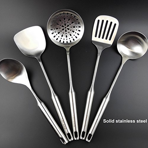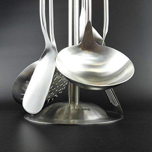 TOPOKO 5-Piece Stainless Steel Metal Reusable Kitchenware Cooking Utensil Set with Stand (Spatula/Slotted Turner, Ladle, Solid Turner, Perforated Strainer, & Solid Spoon)