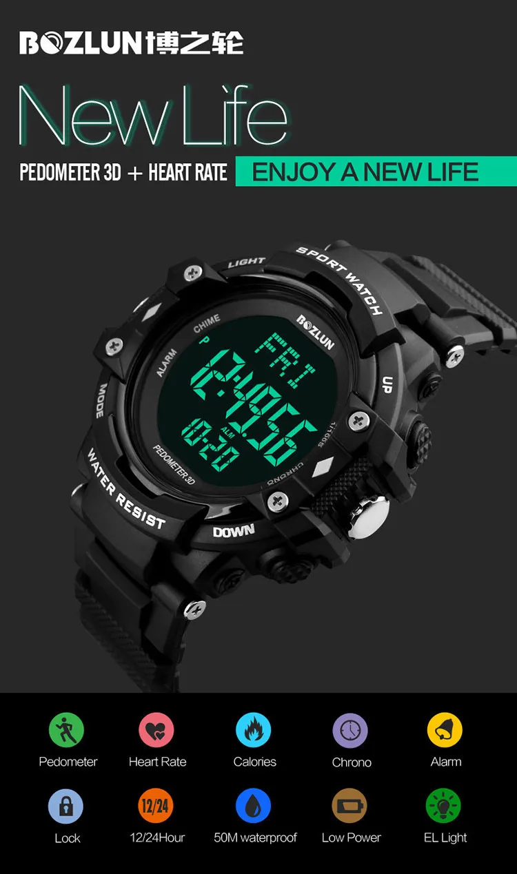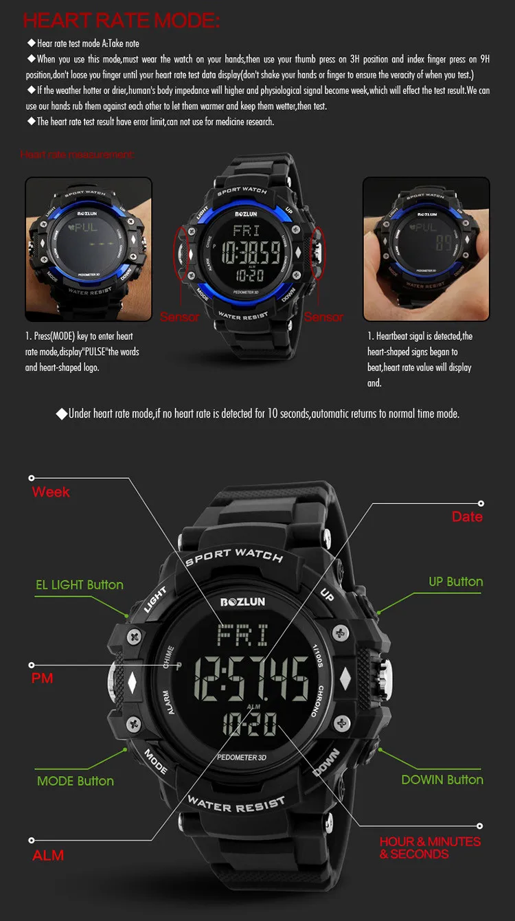 Function:Noctilucent,Passometer,Heart Rate Tracker,Alarm Clock,Chronograph