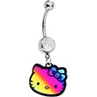 Say hello to your favorite fictional kitty with this cute Hello Kitty dangle navel piercing! The officially licensed Hello Kitty 14 gauge belly button ring comes complete with a pair of aurora accents mounted on a 1/2" durable 316L stainless steel curved barbell. Dangling from the aurora accent is a large rainbow colored Hello Kitty charm, complete with her signature bow. Specifications: 14 Gauge (1.6mm), 1/2" (12mm), 316L Stainless Steel Curved Barbell, Officially Licensed Hello Kitty Body JewelryFeature