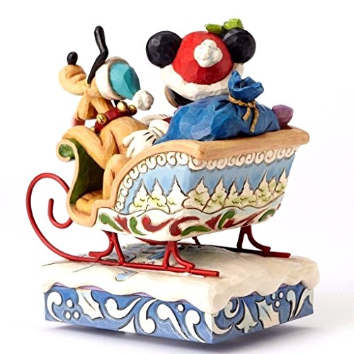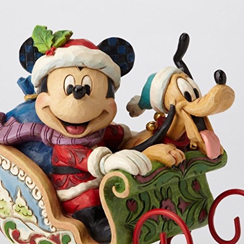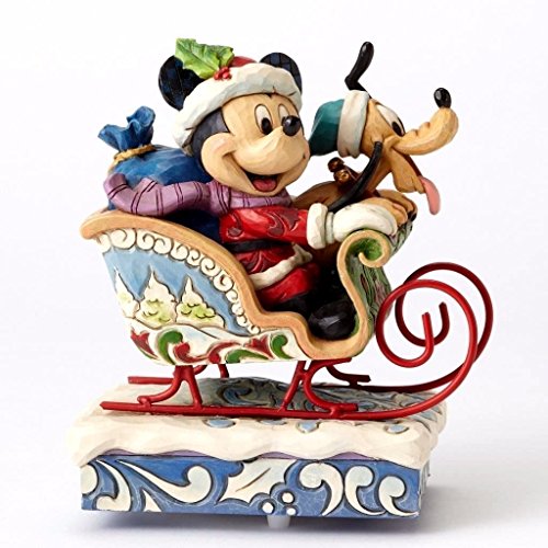 . Laughing All the Way. Mickey and Pluto in Sleigh Christmas Figurine. Part of the Disney Traditions collection designed by Jim Shore. Plays the tune: Jingle Bells. Made from stone resin. Approximately 6.5 inches tall (17cm). Includes original manufacturers box and packaging. Made by Enesco. Disney Jim Shore Laughing All The Way Platinum Star Mickey Mouse Figurine Ol' St. Mick and his trusted companion are dashing though the snow, bearing gifts for you and your loved ones.. This highly detailed wind up musical plays the Christmas favorite Jingle Bells and features real bells around Pluto's collar.. As a finishing touch, Jim Shore's signature will appear on the understamp of this special piece.Feature