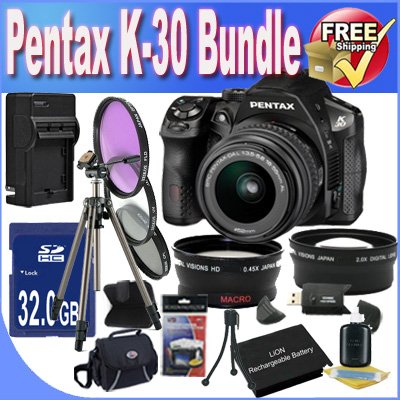 Pentax K30 Digital Camera with 18-55mm AL Lens Kit (Black) + 32GB SDHC Class 10 Memory Card + Extended Life Battery + External Rapid Travel Quick-Charger + USB Card Reader + Memory Card Wallet + Shock Proof Deluxe Case + 3 Piece Professional Filter Kit +