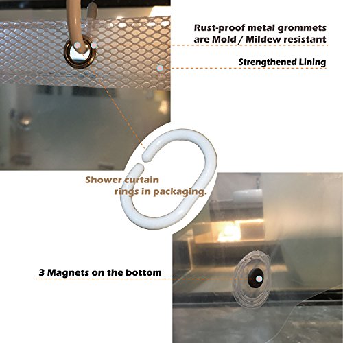 STRENGTHENED RUSTPROOF GROMMET- Different from other shower curtain liners, this one we especially designed the strengthened lining by strong net plastic at the grommet parts, so that when you pull open the liner, it is more sturdy and stand still. And the grommets are always rustproof material.