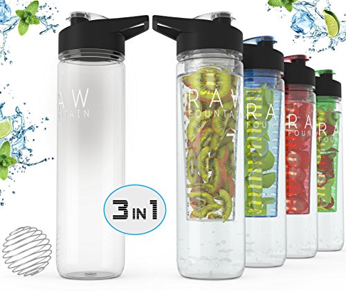 Raw Fountain Fruit Infused Water Bottle + Protein Shaker Bottle - 32oz. Sport Bottle - Tritan BPA Free - 3 in 1 Interchangeable Function For Your Needs!