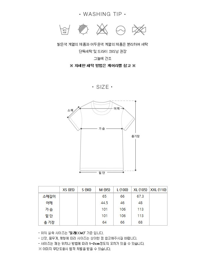 | 되도록 드라이 크리닝 하십시오. 손세탁시 뒤집어 단독세탁 하십시오. 착장시 가방류나 밝은 색상의 의류에 이염 될 수 있으니 주의 하십시오. 반드시 단독 손세탁 또는 드라이 하십시오. 세탁시 탈색의 우려가 있으므로 단독 세탁하십시오. 품질 경영 촉진법에 의한 품질 표시를 꼭 참조하시어 세탁하십시오. 합성세제 세탁시 손상 및 탈색의 우려가 있으므로 미지근한 물에 중성세제로 세탁하십시오. 절대 염소계 표백제로 표백할 수 없습니다. 땀에 젖었을 경우 즉시 세탁하십시오. 심하게 비비거나 비틀어 짜지 마십시오. 물에 10분이상 담가두지 마십시오. 취급부주의로 인한 탈색 및 오염 등 제품의 형태 변질 및 수축된 제품은 보상이 불가능 하오니 주의 하십시요. 취급표시대로 세탁하지 않을시에는 보상받으실수 없습니다. |
