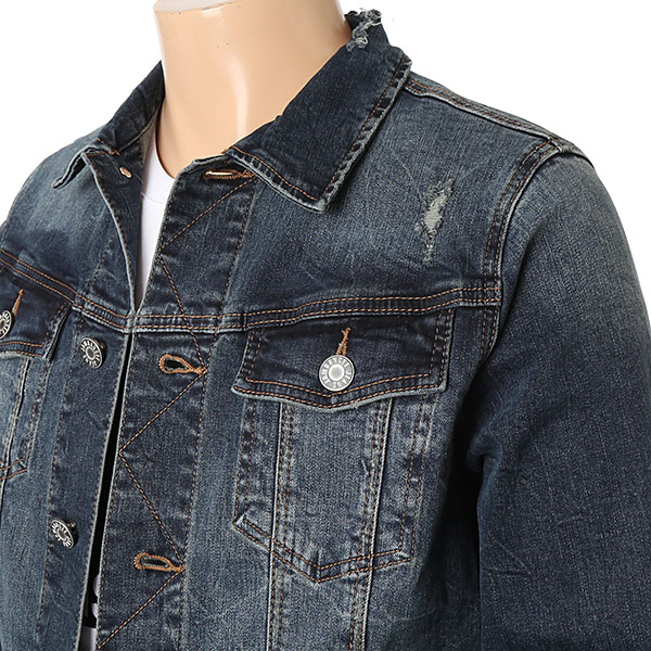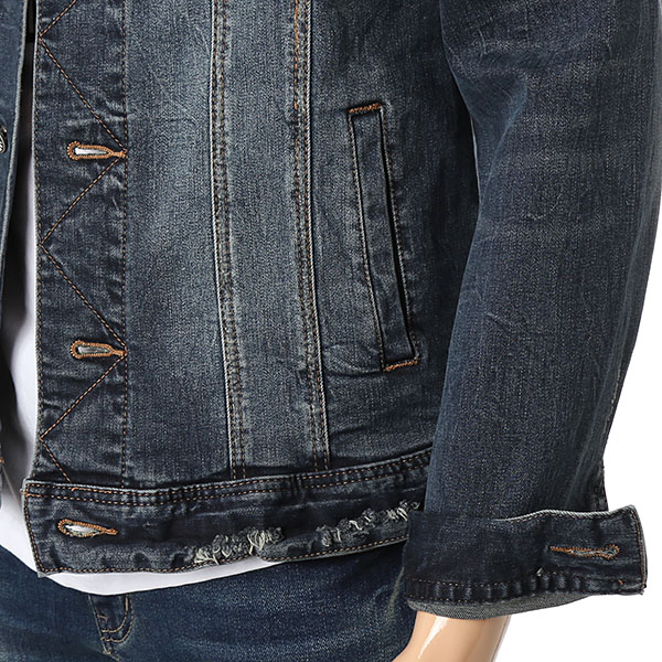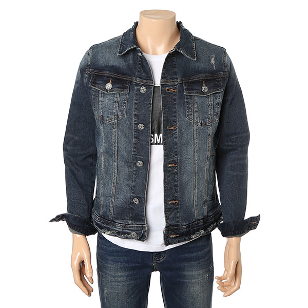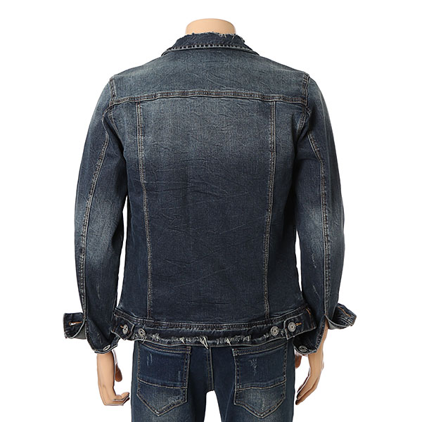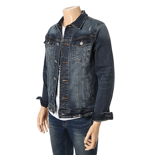 그레이쉬한 DB톤 인디고 칼라에 바이오스톤 시와워싱과 오픈구제 워싱의 남성용 데님 쟈켓.
