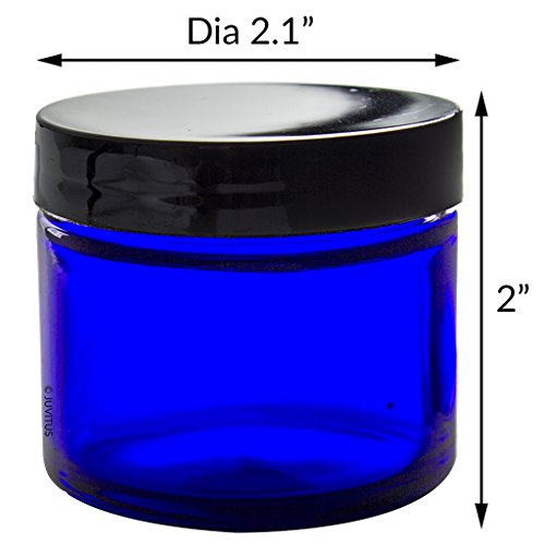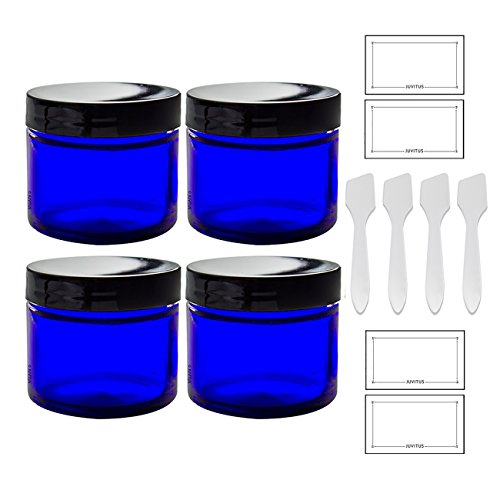Cobalt Blue Glass Straight Sided Jar - 2 oz / 60 ml (4 pack) + Spatulas and Labels - Airtight, Smell Proof, BPA Free Lids