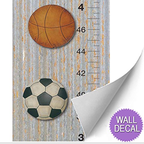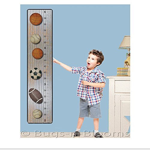 -. Feature : 8 1/4" W x 38" H Basketball Baseball Football Soccer Ball Growth Chart Wall Decals - Sport Balls Height Chart for Children's, Nursery & Baby's Room Decor, Boys Bedroom Walls. 3 Piece Sticker Decal. Starts at 24" (2 foot) & ends at the 60" (5 foot) / Ideal for Baby Nursery Kids Bedroom Boys Girls Room. Bugs-n-Blooms exclusive boys (and girls') growth chart wall stickers are to keep track of your child's growth and at the same time match our sports themed wall decorations. Our growth charts are made of durable vinyl material that simply sticks to the walls and can be removed without damaging the paint. / Our growth chart sticker has images of basketballs, baseballs, football, & soccer ball on a silver textured rustic tin looking background. Please note, this is a sticker and is not metal, it is just to appear as if it is metal and to have texture. Item is flat, not dimensional. Height chart comes in 3 sections that you adhere to the wall in sections. 3 piece lines up to create a decorative wall growth chart. / You can write the date & mark his / her height simply on the vinyl material with a ballpoint pen or Sharpie® marker (not included). Add the coordinating sports wall decals, self-adhesive wall sayings or wall letter decorations (all sold separately) for the finishing touch! Wall decals are a quick way to decorate a little boy's or girl's bedroom, nursery or playroom. / SEE STORE POLICIES: regarding wall stickers, due to the customization, delicate and fragile nature. Please contact us if you have any questions and be sure to visit our 'How To Apply Wall Stickers' & "How To Apply Growth Chart Stickers" pages for more information P.R.Ior to purchasing: http://www.amazon.com/gp/aag/details/ref=aag_m_fi?ie=UTF8&asin=&isAmazonFulfilled=&isCBA=&marketplaceID=ATVPDKIKX0DER&orderID=&seller=A2RFZLVKNCOP5I#custom2