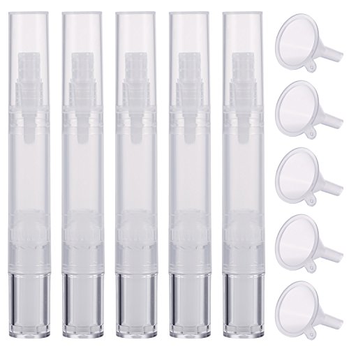 Maxdot 5 Pack 5 ml Transparent Empty Nail Oil Twist Pen Lip Gloss Brush Applicators Eyelash Growth Liquid Tube with 5 Pack Funnels