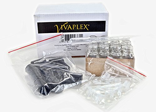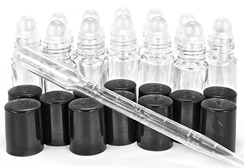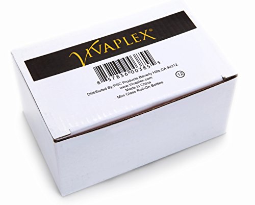 - 12 clear, glass, mini roll-on bottles with black caps.