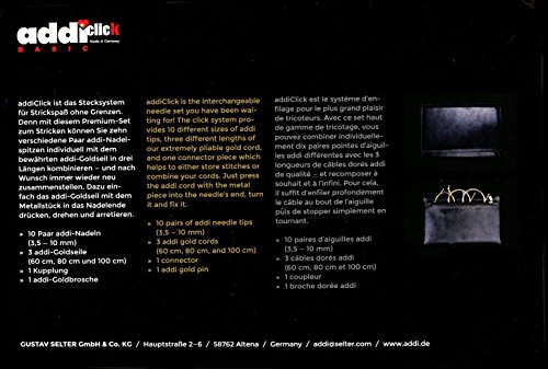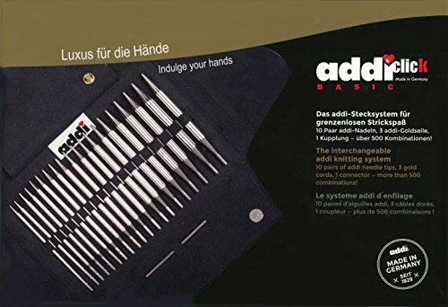 - UPDATED SIZES: Each addi Click Basic set includes 10 different sizes of addi tips: US 4, 6, 7, 8, 9, 10, 10.75, 11, 13, 15; Metric 3.5, 4.0, 4.5, 5.0, 5.5, 6.0, 7.0, 8.0, 9.0, 10.0mm; includes exclusive and extremely pliable cords which create needle sizes US 24", 32", and 40"; Metric 60, 80, 100cm