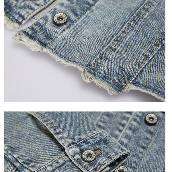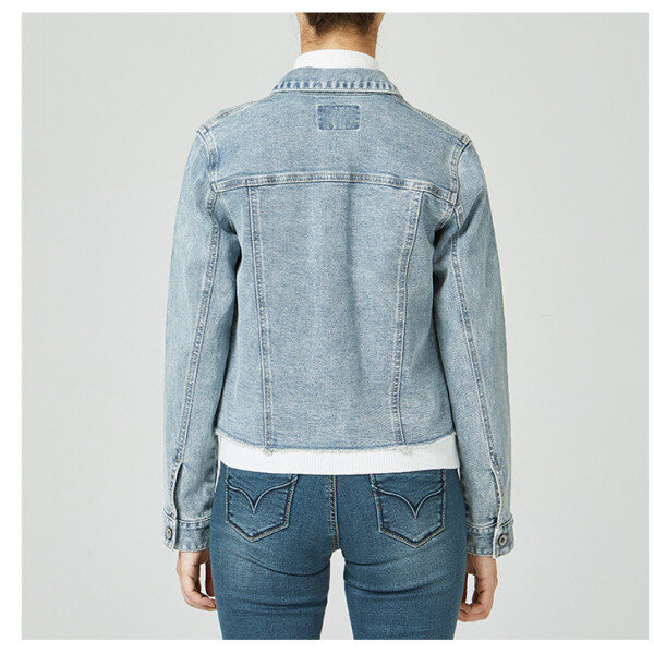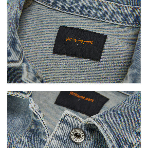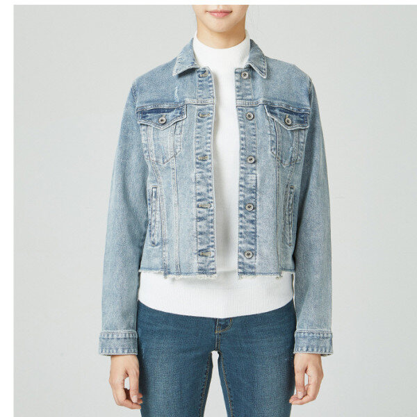 밝은 MB톤 인디고 칼라에 은은한 스노우 구제워싱의 크롭기장의 트렌디한 여성용 데님 쟈켓 데님 스타일입니다.