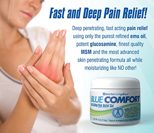 -. Feature : 1000's of Satisfied, Pain Free Customers - Deep Penetrating, Fast Acting Ultimate Pain Relief Using Only the Purest Refined Oil, Potent Glucosamine, Finest Quality MSM and the Most Advanced Skin Penetrating Formula Known to Relieve Your Pain Fast and Keep Lasting All While Moisturizing Like NO Other / Fastest and Deepest Pain Relief in Our Category - We Took The Best Formula and Made it Better - NOW WITH VITAMIN C, MSM, Glucosamine & Menthol - Check Our Natural Extract Ingredients and See Why We Rule the / 100% Satisfaction Guarantee - No Risk - Just Pain Relief from Arthritis, Joint Pain, Muscle Pain, Tendonitis, Bursitis, Carpal Tunnel, Plantar Faschiitis, Tennis Elbow, Golf Elbow, Jumpers Knee, Hip - Neck - Back - Shoulder - Lower Back Pain - & Chronic Pain Caused by Injury, Age and Inflammation. We have the solution, if it doesn't work for your pain, send it back and we will refund your money with no questions asked. Ridding the earth of pain one Amazon customer at a time. / When You Purchase Our Blue Comfort, You Are Getting The Best Blue Gel Available. You are Also Getting Our Industry Leading Satisfaction Guarantee or Your Money Back! No Questions Asked. We Are 100% Confident You Will Love It. / See why we are converting users of Salonpas, Penetrex, Biofreeze, Blue and other balms and ointments - Now Available On Amazon Exclusively From Doctor Care Plus. 4 oz Gel/Cream