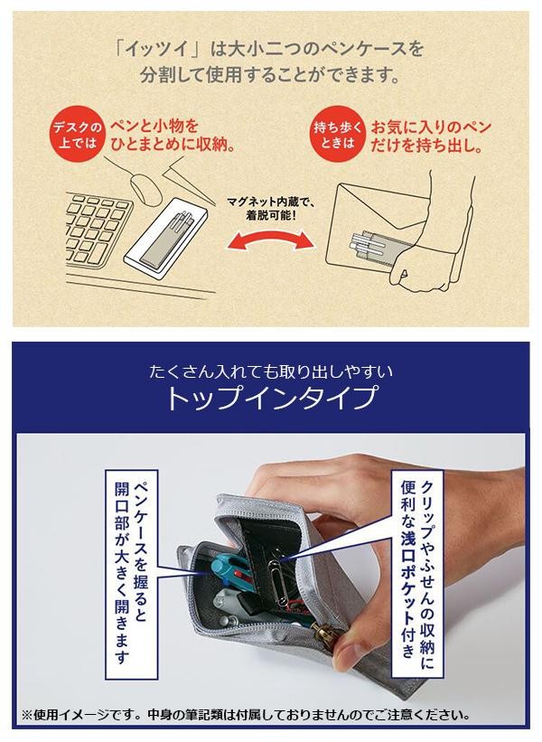 大小二つのサイズのペンケースが、マグネットで一体型になっているペンケースです。一つにまとめたり別々にして持ち歩くことが可能なので、使用するシーンに合わせて必要な容量のペンを持ち歩けます。開口部が大きく開く「トップインタイプ」で、中のペンが取り出しやすい形状です。入口付近に浅いポケットが付いているのでクリップや消しゴムなどの小物がすぐに取り出せます。 |
