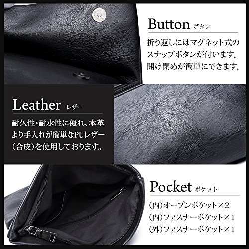 -. Feature : シンプルでスタイリッシュなデザインのクラッチバッグ。高品質PUレザー(合皮)を使用していて上品な光沢がある バッグ です。 ビジネスシーン パーティ 食事 お出かけ など幅広く対応できる かばん です。 / 折り返しはマグネット式のスナップボタンがついて開け閉めが簡単。ファスナーもついていますので、中のものが飛び出す心配もありません。 / コンパクトサイズですが収納力があり、小物類を持ち運ぶのに適しています。メンズとしてはもちろんのこと、 レディース のクラッチバッグとしてもオススメです。 / 【ポケット】(内側)オープンポケット×2、ファスナーポケット×1、(外側)ファスナーポケット×1【サイズ】(Lサイズ)横32cm×縦21cm×マチ5cm(Mサイズ)横27cm×縦17cm×マチ5cm / クラッチバッグは、Marie Ange(マリーアンジュ) のブランドアイテムになります。Marie Ange(マリーアンジュ) の商品には、オリジナル布ポーチ(サイズ:12cm×18cm)が付属します。