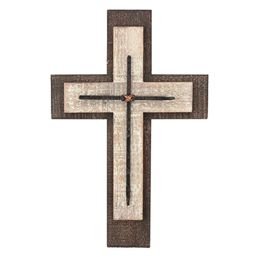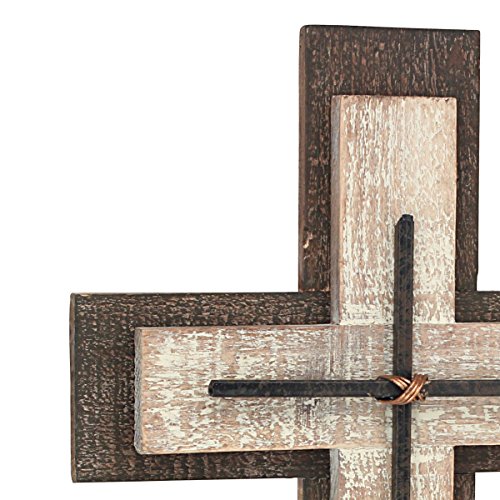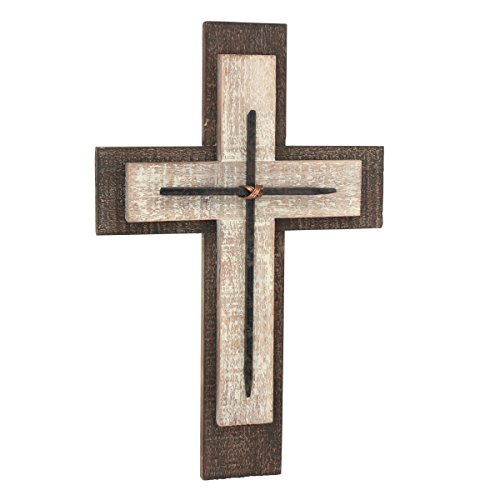 - This cross features a brown wooden base accented with a raised worn white cross & a small metal cross in the center giving an elegant vintage feel