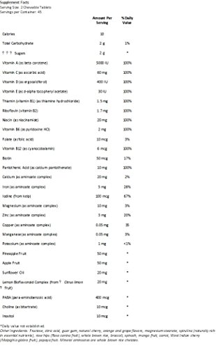 Each chewable tablet supplies 16 vitamins and 8 minerals, as well as nature's most healthful whole foods, including spirulina, carrot, broccoli, whole brown rice and spinach.