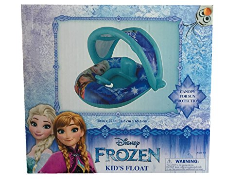 -. Feature : Disney Frozen themed kids pool float with your kid's favorite characters, Elsa and Anna / Includes a canopy for added sun protection / Measures 30 in x 27 in (76.2 cm x 68.6 cm) when inflated / A fun and adorable way for your baby or toddler to splash in the pool safely alongside you / Ages 1-2; Warning: This product is not a life-saving device and should be only be used with adult supervision.