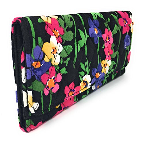 Trifold Wallet has a quilted fabric exterior and a black lined interior. The outer flap closure has dual hidden magnetic snaps in the front. A zipper pocket on the back. Interior features 3 bill pockets, 12 card slots and an ID window.Feature