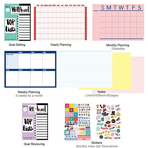 Total pages are 252p: Goal setting /Yearly plan/ Monthly plan(12 months)/ Weekly plan(5 weeks each for 12 months)/Free note(Line, Grid, Blank)/ Full colored glossy stickers(Index tab, decorative stickers) / Review the year goal/ Personal data