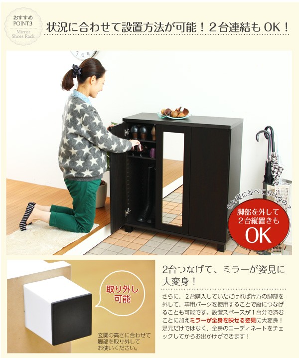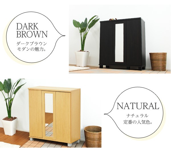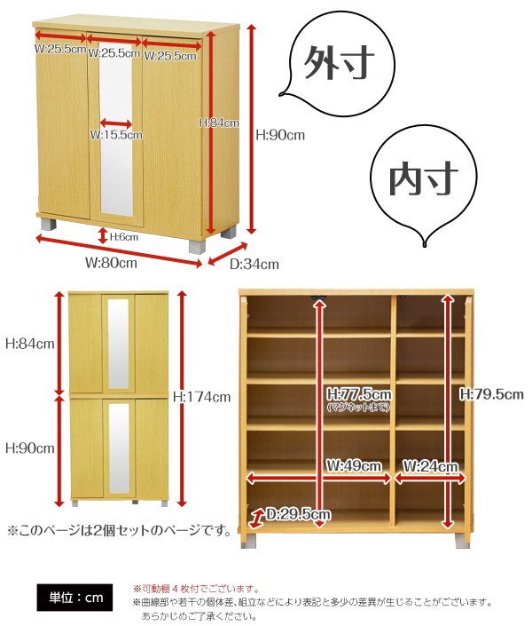 【商品について】ミラー付きシューズボックス【幅80cm】(下駄箱・玄関収納)2個セット■サイズ:(1個あたり)外寸:(約)幅80cm×奥34cm×高さ90cm 内寸:左/幅49cm×奥29.5cm×高さ79.5cm右/幅24cm×奥29.5cm×高さ79.5cm※商品重量:(約)24kg■カラー:ダークブラウン ナチュラル ホワイト■素材:パーチクルボード、中密度繊維板(MDF)、プリント紙化粧合板■その他:・お客様組立商品です・梱包サイズ:(1個あたり)(約)99x38x21cm(2.9才)・梱包重量:(約)25kg※2個セットでの販売です。 ※メーカー直送品、商品代引き不可