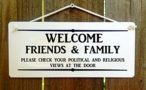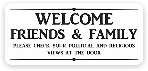WELCOME FRIENDS AND FAMILY NO POLITICS NO RELIGIOUS VIEWS - aluminum sign - 4" x 9"