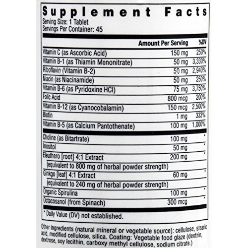 The perfect one-tablet-a-day B-complex for when you?re feeling fatigued, providing a complete B-50 complex, with extra B-5 and choline, to support physical and mental energy.* Also features herbs like ginkgo, commonly known as ?the mind herb,? and Siberian ginseng, a classic adaptogenic herb that increases overall vitality, in a base of spirulina.