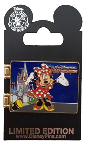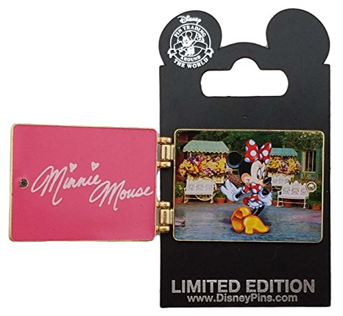 - The pin opens up and there is a picture of Minnie Mouse in front of flower stands, and the inside cover is pink with her autograph / signature on it