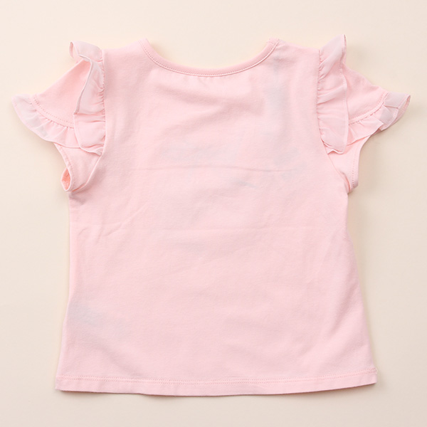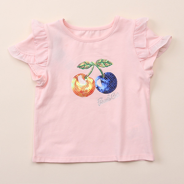 상세설명-피치빛이 감도는 사랑스러운 핑크 컬러의 반팔 티셔츠로, 소매에 쉬폰 프릴이 귀여운 느낌을 줍니다. 시원한 느낌을 주는 빅사이즈의 앵두 자수 포인트가 블링블링한 포인트가 되는 제품입니다.