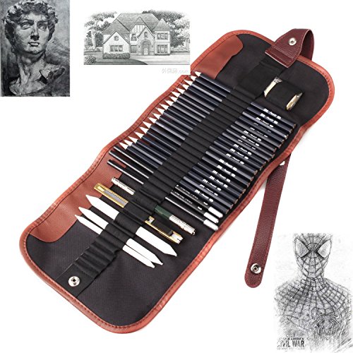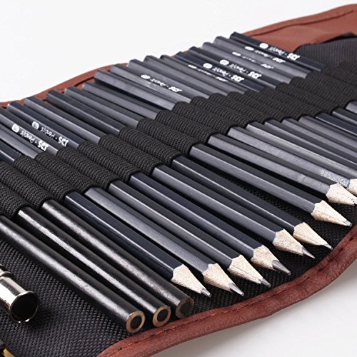 - 18pcs Sketch Pencils set (HB/1pcs, B/1pcs, 2H/2pcs, 2B/4pcs, 3B/2pcs, 4B/4pcs, 5B/1pc, 6B/1pc, 7B/1pc, 8B/1pc), 3 Charcoal Pencils(Soft, Neutral, Hard), 4B Eraser/1pcs, Kneadable eraser/1pcs, Craft Knife/1pcs, Pencil Extender/1pcs, Pencil Bag/1pcs, 29pcs in total
