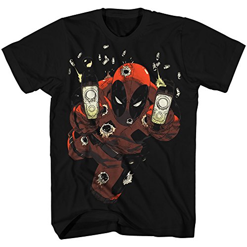 -. Binding : Apparel -. Brand : Mad Engine -. Department : mens -. Feature : Adult standard US Men's sizes / Officially Licensed Marvel Comics / Professionally designed and printed / Features Deadpool in action flying through the air firing off clips! AND it glows in the dark! / Great for fans of the Deadpool movie and Marvel Comics! -. ProductGroup : Apparel -. ProductTypeName : SHIRT -. Title : Deadpool Empty Clips Glow in the Dark Mens Black T-shirt