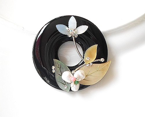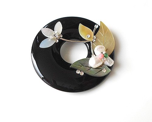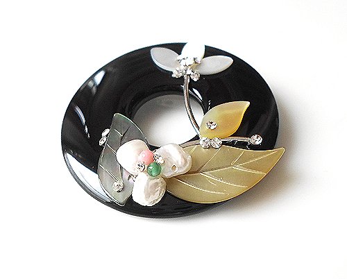 -. Feature : Size : about 1.8" X 1.8" / Materials - Onyx Stone, Mother Of Pearl, Cultured Pearl, Austrian Crystal Rhinestone, Glass Bead, Brass Pin / High Quality Handmade Onyx Shell Crystal Combination Ornate Round Brooch Pin. / Made in Korea