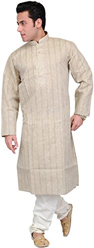Exotic India Khadi Kurta Pajama with Thread Embroidery on Neck