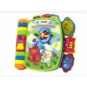 Open a page to learning with the Rhyme & Discover Book! Recommended for kids 6 months to 3 years, the Rhyme & Discover Book combines rhythm and rhyme with nursery favorites. The electronic book includes three light-up character buttons on the tabs of the pages. Seven popular nursery rhymes and easy to turn pages encourage playing, thinking, and learning. The Rhyme and Discover Book features four movable pieces that your baby will love. The side of the book features bright colors and a music note button. Light up learning time for your little one with the Rhyme & Discover Book. Parent Friendly FeaturesParent-friendly features include an automatic shut-off to preserve battery life. A durable design allows for long-lasting play while volume controls allow for quieter play. The Rhyme & Discover Book was developed with your child’s development in mind. Age-appropriate vocabulary and nursery rhymes introduce familiar animal names and sounds. Sing-along songs encourage verbal skills and familiar melodies and sing-along songs promote parent-child interaction. The twinkling lights and bright colorful graphics attract baby's attention. Turning pages promotes gross motor development and sliding buttons strengthens fine motor development. About Vtech Vtech, the creator of the Electronic Learning Products (ELP) category, is a world leader in age-appropriate learning toys. Since 1976, Vtech has been developing high-quality, innovative educational products for children from birth to tween. Its toys deliver 'smart play' through the combination of entertaining electronic formats and engaging, age-appropriate content that helps children learn while having fun.Feature