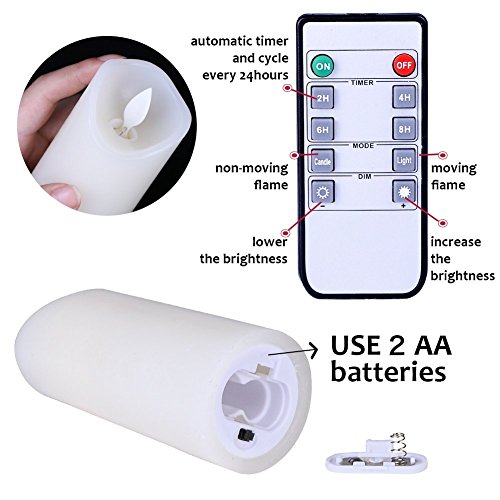 - EASY & CONVENIENT OPERATION: With One REMOTE CONTROL, You Could Control Flameless Candles of Different Sizes and Our Sets of 4”5”6” Flameless Candles.Once the timer is set, the candle comes on at the same time each day Timer feature allows you to set 2H | 4H | 6H | 8H, timed to automatically turn on and off.