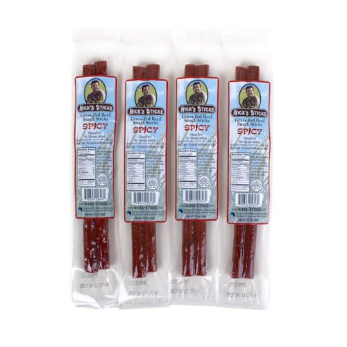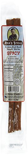 -. Binding : Misc. -. Brand : Nick's Sticks -. EAN : 0798304258462 -. Feature : 100% Grass-Fed Beef Sticks / No Sugar / Organic Seasoned salt / No MSG or Nitrates / 100% Gluten Free -. Label : Wallace Farms -. LegalDisclaimer : Actual product packaging and materials may contain more and different information than what is shown on our website. We recommend that you do not rely solely on the information presented and that you always read labels, warnings, and directions before using or consuming a product. -. Manufacturer : Wallace Farms -. PackageQuantity : 12 -. ProductGroup : Grocery -. ProductTypeName : GROCERY -. Publisher : Wallace Farms -. Studio : Wallace Farms -. Title : Nick's Sticks Spicy 100% Grass-Fed Beef Snack Sticks - Gluten Free - No Antibiotics or Hormones (12 packages of 2 sticks) -. UPC : 798304258462