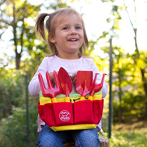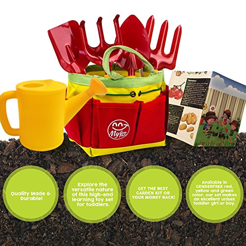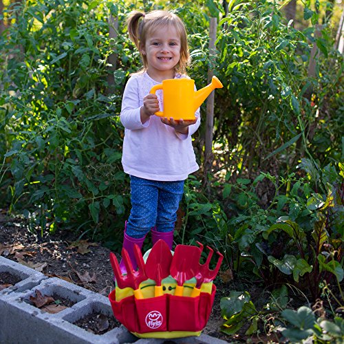 A TREMENDOUS VALUE TODDLER GARDEN TOY SET!: Save money on buying separately kids' gardening tools! Our COMPLETE toddler gardening kit includes 2 RAKES, 1 TROWEL, 1 SHOVEL & 1 WATERING CAN neatly stored in the handy CARRY TOTE. The premium outside play equipment is accompanied by a cute illustration GUIDE BOOK with useful tips for little gardeners!