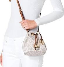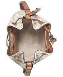 Drawstring closure Gold hardware Adjustable crossbody strap with a 23" drop Interior features 1 slip pocket and 4 card slots Measures approximately: 6" W x 6-1/2" H x 4" D