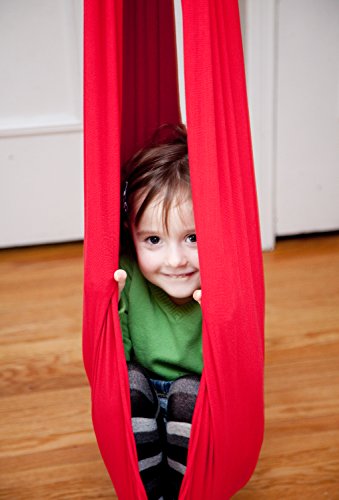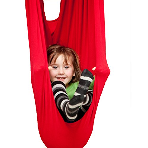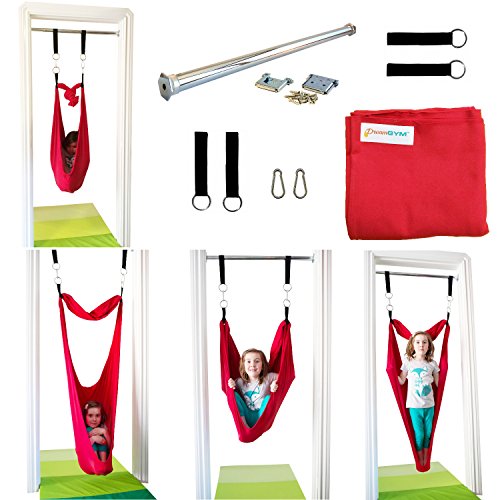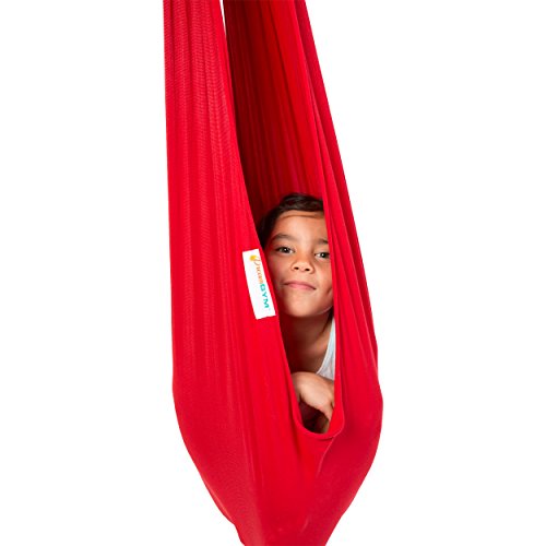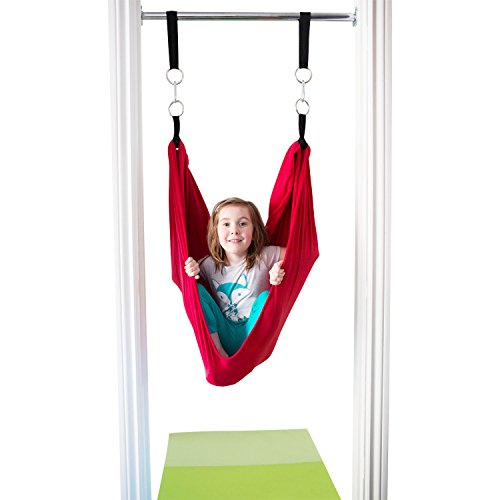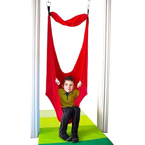 DreamGYM Doorway Sensory Swing is a great solution for any space big or small. Chrome plated bar, adjusts to fit most standard width door frames from 24″ to 36″ wide. The weight capacity for the bar alone is 300 lbs therefore teenagers and adults can do chin-ups too, the weight capacity for a sensory swing is 100 lbs (45 kgs). This Doorway Sensory Swing kit includes: - doorway support bar - mounting hardware, - four (4) hanging straps, - two (2) spring clips - sensory swing. You can hang many other accessories, such as: rope ladder, gym rings, trapeze bar combo, etc. (not included, check our other products). Therapy Cuddle Swing is great for providing vestibular input for children with sensory processing disorder and autism. Deep pressure create calming effects. The cuddle swing is commonly used in occupational therapy, it helps to stimulate child's vestibular system and give him deep touch pressure. This cuddle swing is a very simple device, four-way stretchable fabric squishes the child inside and rocks him/her back and forth, up and down. It is recommended by occupational therapists and can be used for home therapy. It is made of high quality stretching fabric (92% cotton, 8% lycra/spandex). It has soft and natural feel. It will always have a four-way stretch and you will not get bagging in highly stressed areas. The cuddle swing is machine washable. Machine drying is acceptable, but as with all cotton fabrics, it is recommended to hang for drying. 0 |