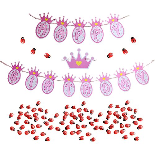 Elecrainbow Mini Happy Birthday Banner with 50 pcs Cute Ladybug Beatles for Pink Birthday Party Decoration