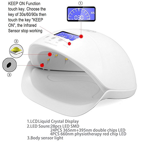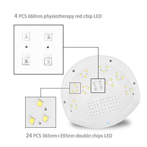 ?DOUBLE UV/LED TECHNOLOGY 24pcs 365nm 395nm long lasting white UV LED light beads to curing all type of nail gel polishes , fast dryer your nail gels. 4pcs 660nm red chip led, this UNIQUE physiotherapy red LED 660nm design, care and whitening your skin,