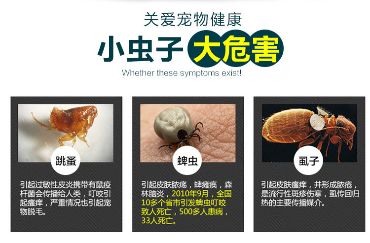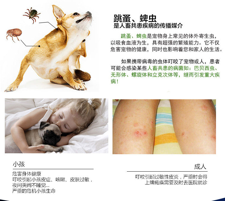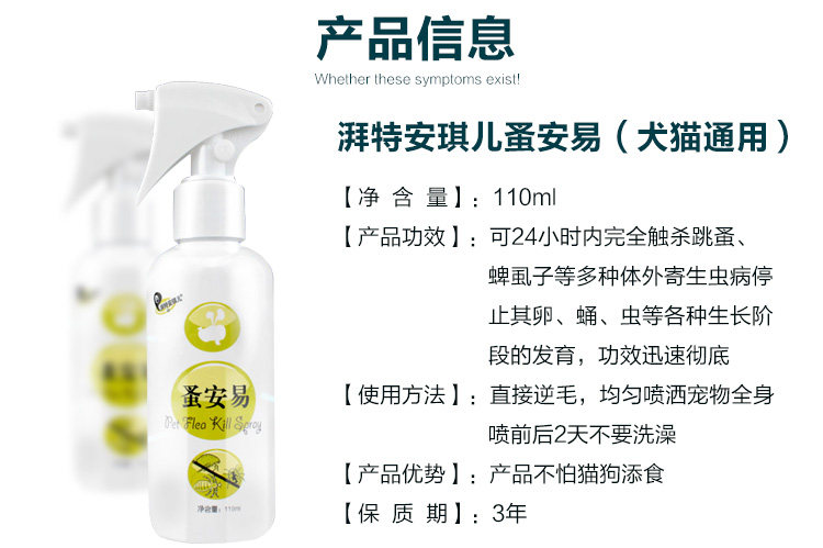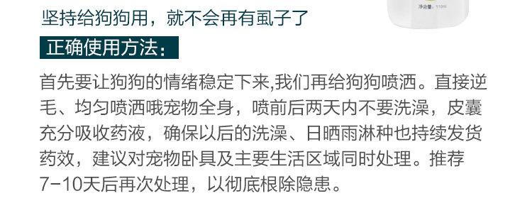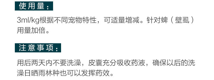 Recommended dosage: 3ml/kg, according to the characteristics of different pets, may be appropriate. For the tick, tick and double dosage. Direct against hair sprayed body. Do not take a bath within 2 days after spraying.